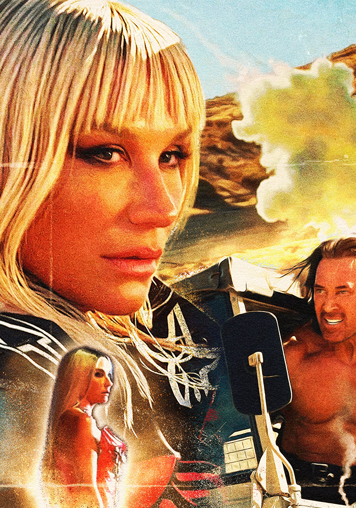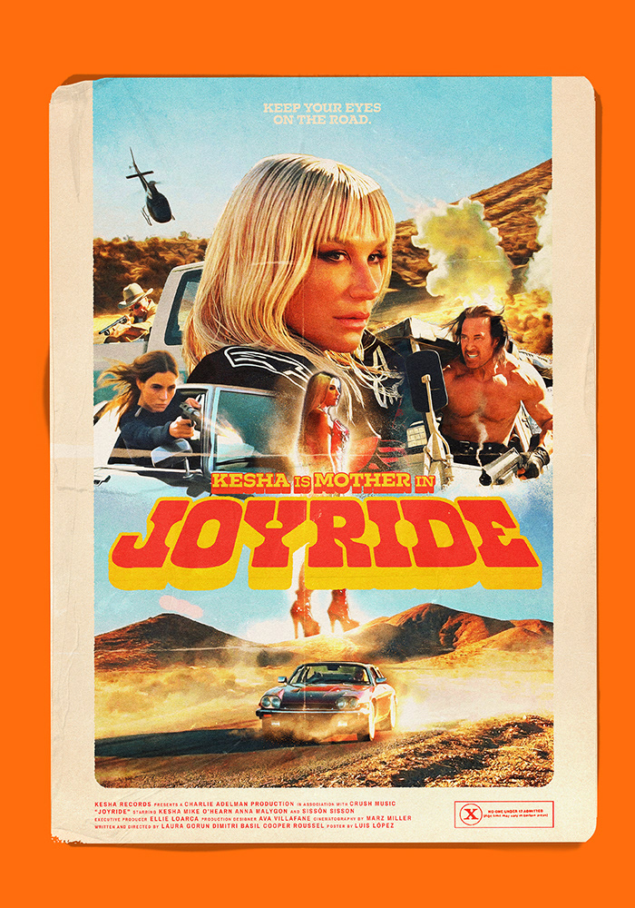 Homage poster for Kesha’s JOYRIDE (2024). Starring Kesha, Mike O’Hearn, Anna Malygon and Sissón Sisson.